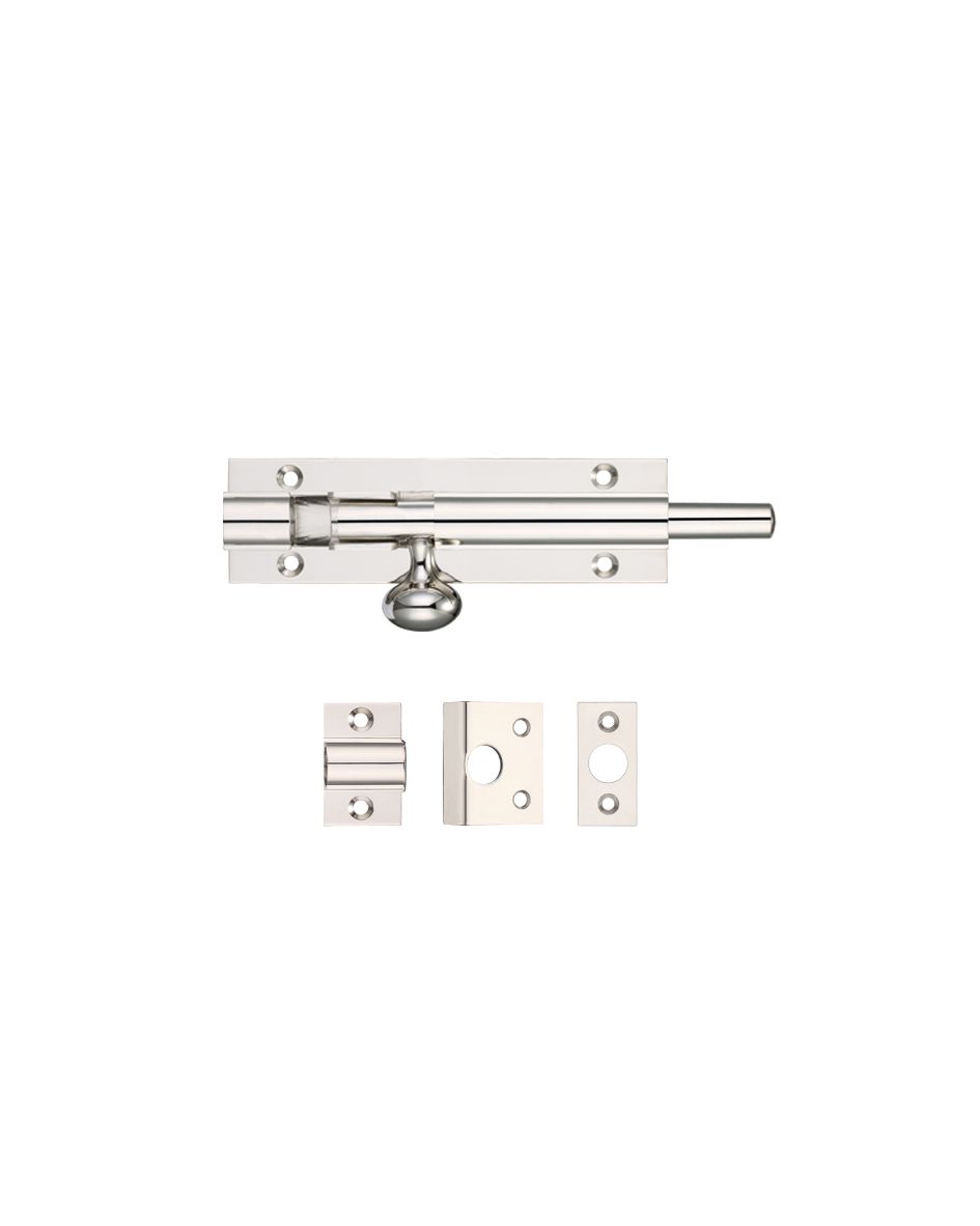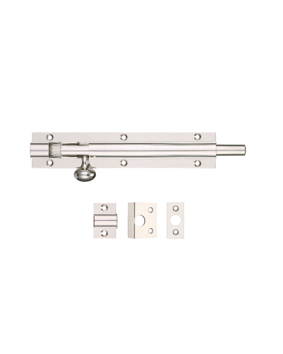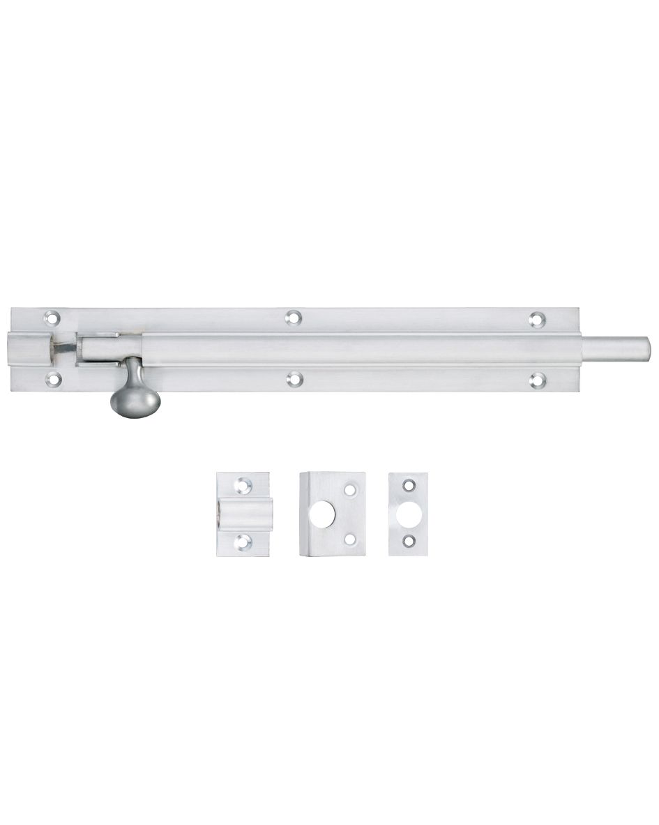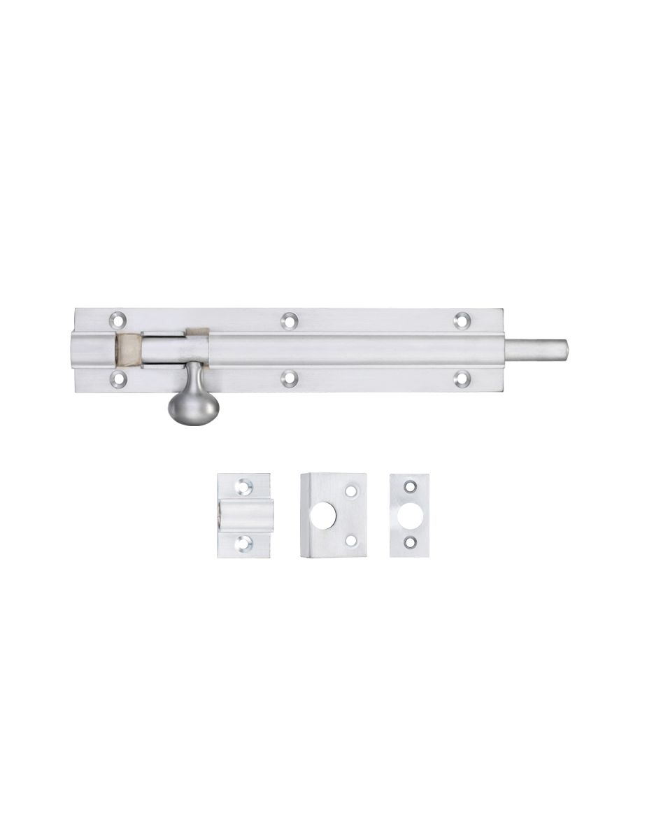 This architectural barrel bolt is Supplied with a flat plate striker, angled strier for outward opening doors and a face fix keep with matching screws.