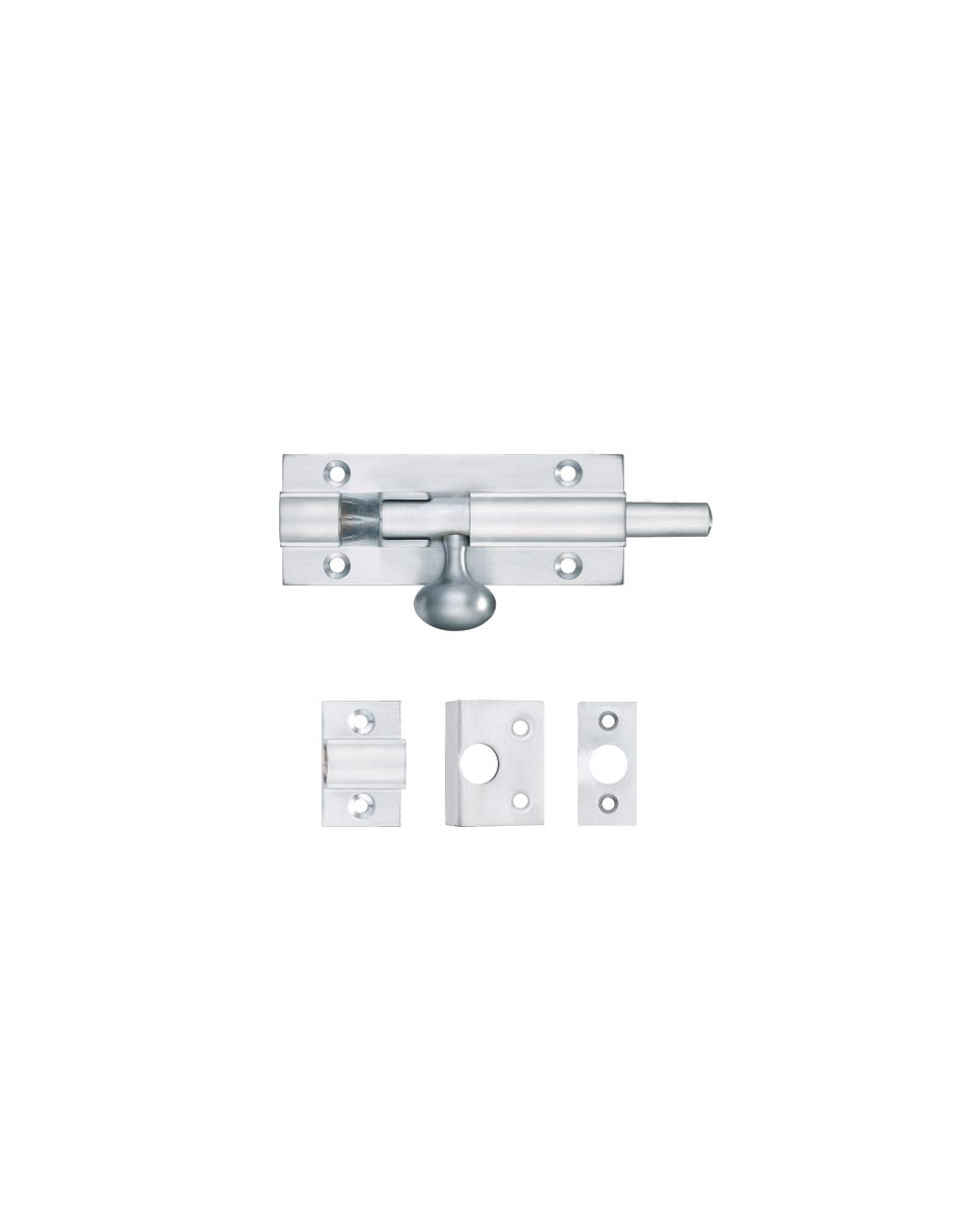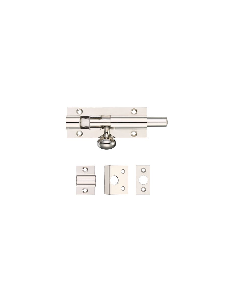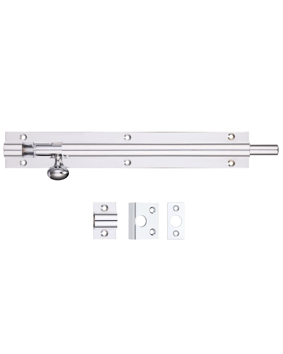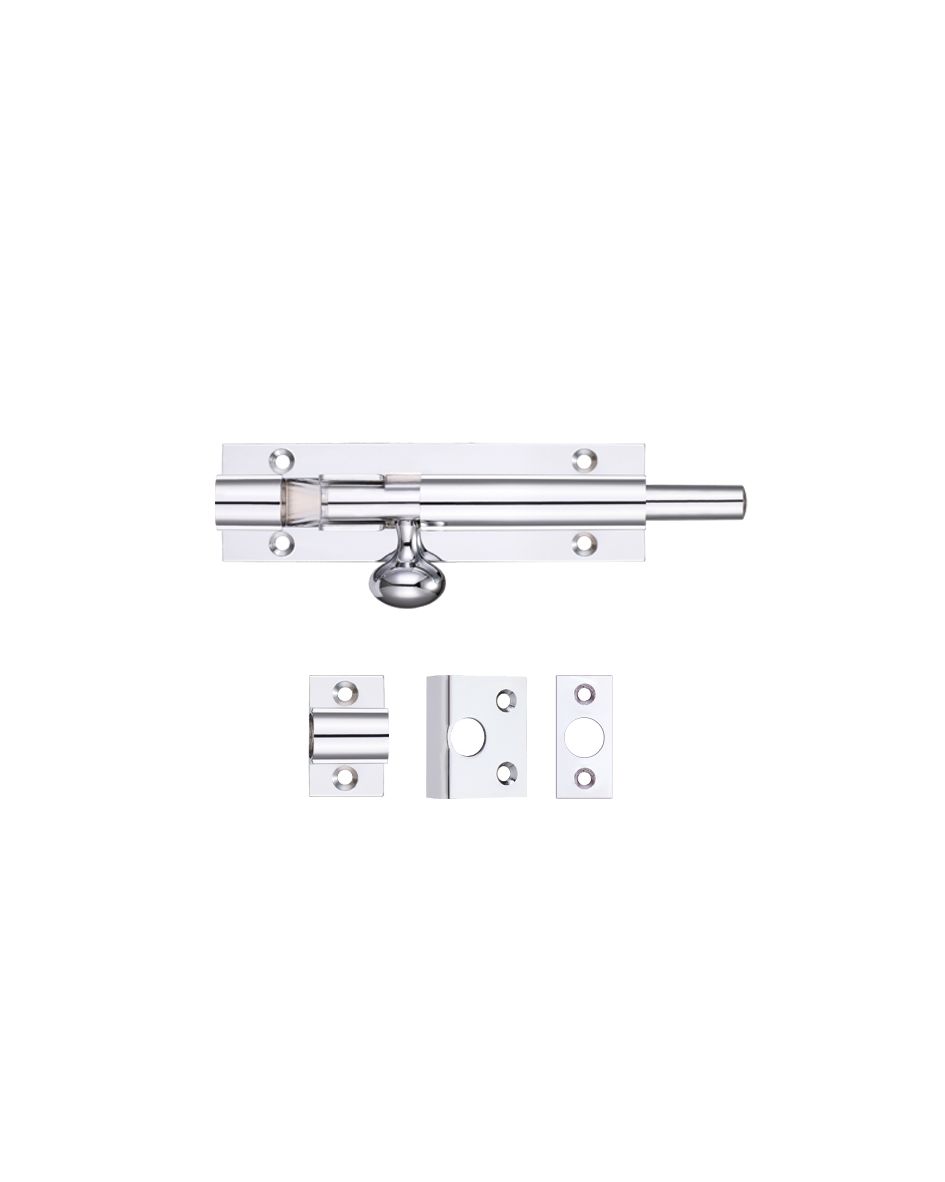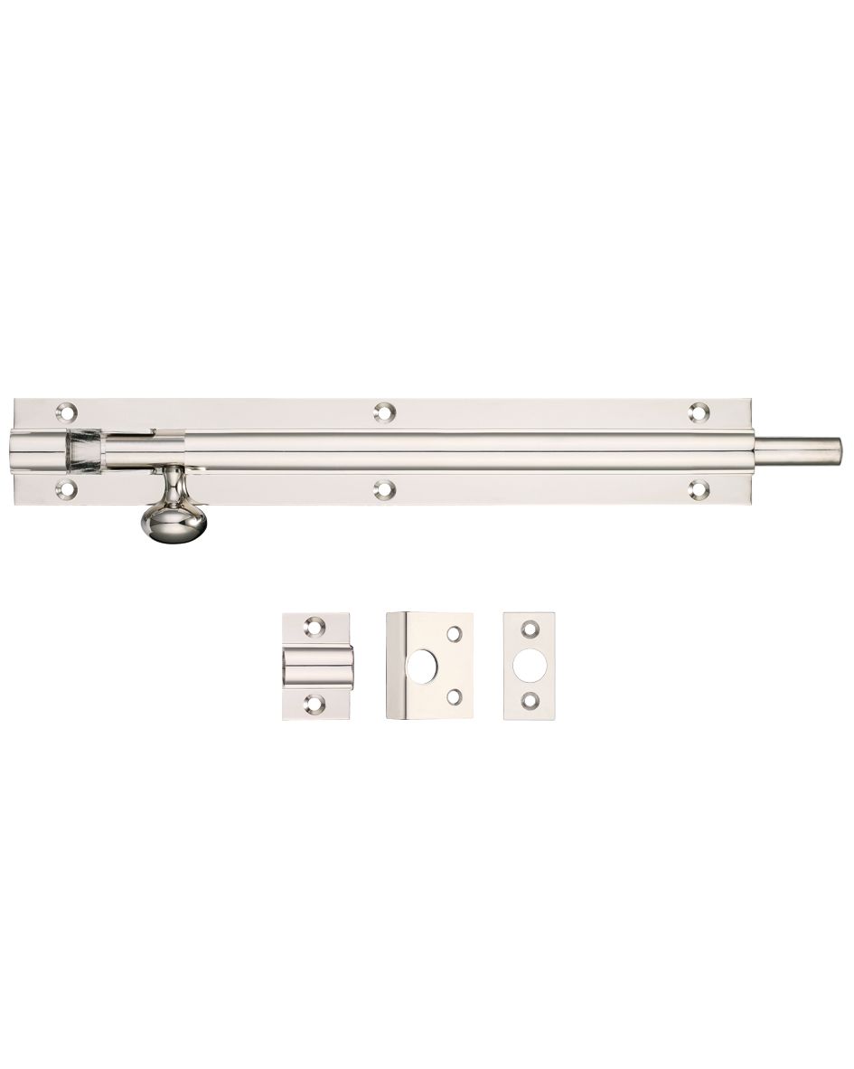 This architectural barrel bolt is Supplied with a flat plate striker, angled strier for outward opening doors and a face fix keep with matching screws.