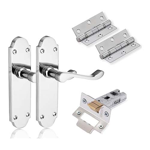 - Key Features: Premium Lever Door Handle: Stylish back plate design with smooth operation and ergonomic grip. Tubular Latch: Provides secure locking and easy installation. Ball Bearing Hinges: Ensures smooth and noise-free door movement. Elegant Finishes: Available in PC, PB, and SCP to complement various interior themes. Complete Pack: Includes all necessary components for a quick and efficient setup.