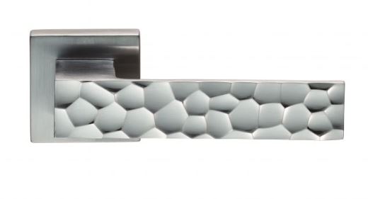 A chunky flat bar style lever forming into a square neck on square rose. The face of the lever has intricate random sculpted shapes which being subtly angled catch the light and enhance the overall appeal. Concealed fix 2 part rose. Available in various finishes. Compliments the Carlisle Brass accessory range on square rose. Comes with a 10 year mechanical guarantee and is suitable for domestic and commercial use.