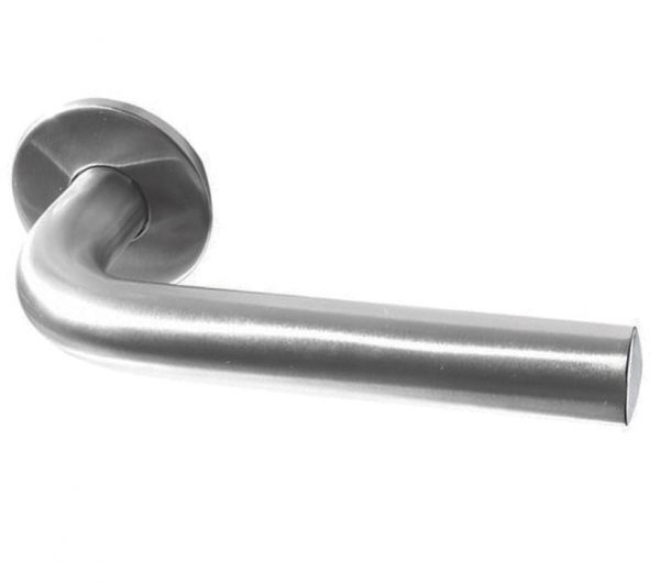 Radium Door Handles On Round Rose, Satin Stainless Steel (sold in pairs)