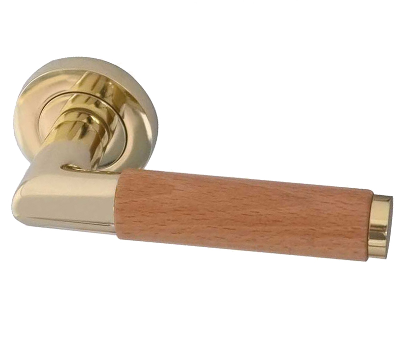 Reguitti Havanna Light Wood Door Handles On Round Rose, Polished Brass (sold in pairs)