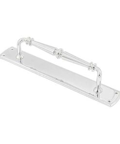 - The Renata Door Pull Handle on Backplate in Polished Chrome is a sleek and contemporary hardware piece, combining style and functionality.