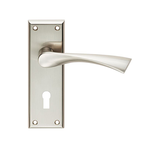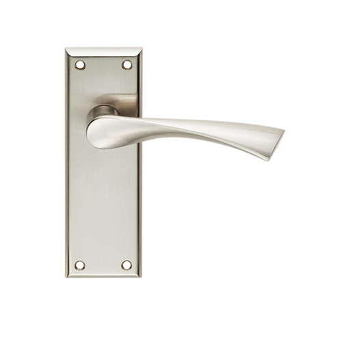 This Serozzetta Door handle lever is on a chamfered edge rectangular, with a stunning eye-catching design. The lever has an angular downward twist making it ergonomic in use as well as being extremely stylish. This Door Handle is available in a Satin Nickel Finish. This Product is Available in Lock, Latch, Bathroom, and Euro Profile Lock Style. Dimensions: Backplate – 150mm x 50mm x 10mm, Lever length 121mm, Projection 66mm