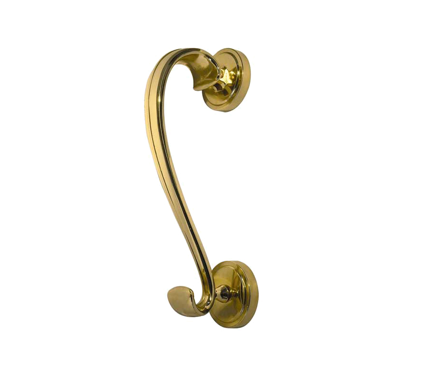 Sloan Scroll Door Knocker On Round Rose, Polished Brass